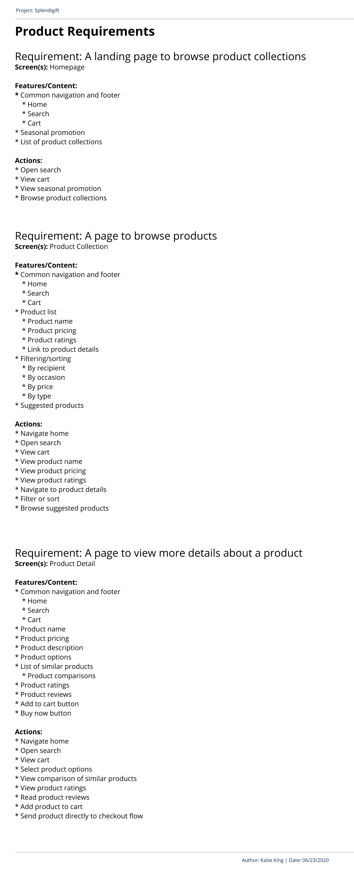 I identified five main screens from the user tasks: Homepage, Product Collection, Product Detail, Cart, and Checkout. Some elements appear on every screen, such as the navigation bar, and at least one product name and price. There was also an opportunity for a lot of re-use with simple screen variations such as Product Collection filtering for recipient, or occasion, or price, or type, et cetera.